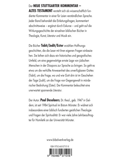 Die Bücher Tobit/Judit/Ester erzählen Hoffnungsgeschichten, die die Leser mit ihren eigenen Fragen einbeziehen. Sie leihen sich dazu ein historisches und geografisches Umfeld, um eine gegenwärtige ernste Lage von jüdischen Menschen in der Diaspora zur Sprache zu bringen. So geht es etwa um die verhüllte Anwesenheit des unverfügbaren Gottes (Tobit), um die Frage, wo und wie Gott drin ist im Geschehen der Tage (Judit), um die Frage von Gegengewalt in mörderischer Bedrohung (Ester). Der Kommentar beleuchtet eine unerwartet spannende Literatur.